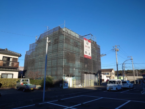 前回ご紹介したものとは違うネイビーの弊社の足場幕がかけてあります。